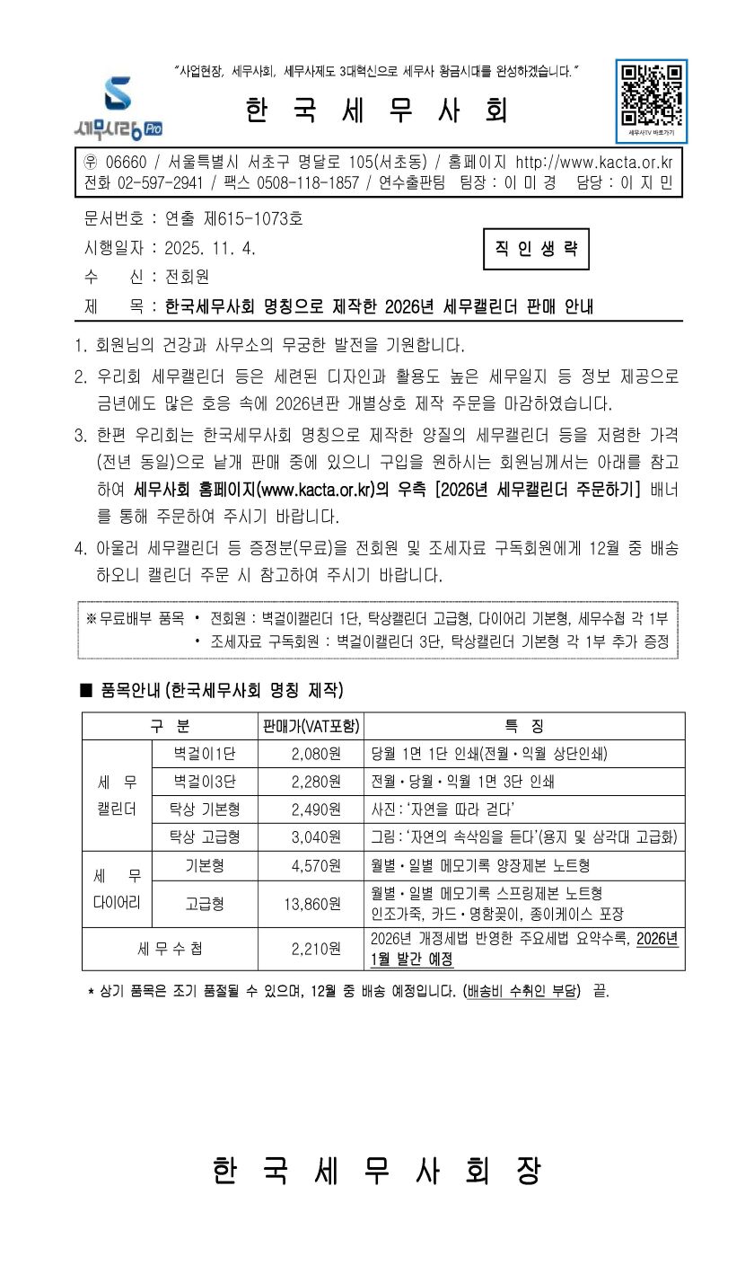 Çѱ¹¼¼¹«»çȸ »óÈ£·Î Á¦ÀÛÇÑ 2025³âµµ ¼¼¹«Ä¶¸°´õ ÆÇ¸Å ¾È³»