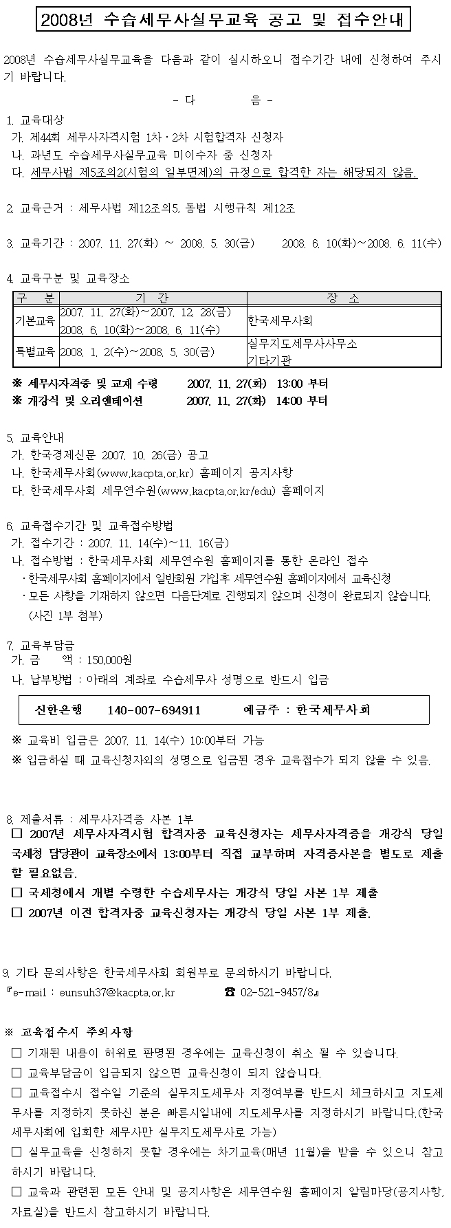 (¹Ýµå½Ã, ¿ì¸®È¸ ȨÆäÀÌÁö¿¡ ÀϹÝȸ¿øÀ¸·Î °¡ÀÔÇϰí, ·Î±×ÀÎÇÑ ÈÄ ¼¼¹«¿¬¼ö¿ø(http://www.kacpta.or.kr/edu) ¸Þ´º¿¡¼[±³À°¼ö°½Åû] -> [¼¼¹«»ç½Ç¹«±³À°]ÀÇ "2008³â ¼ö½À¼¼¹«»ç ½Ç¹«±³À°" À» Ŭ¸¯ÇÏ¿© ½ÅûÇϼ¼¿ä)