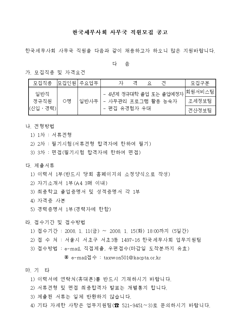 Çѱ¹¼¼¹«»çȸ »ç¹«±¹ Á÷¿ø¸ðÁý °ø°í