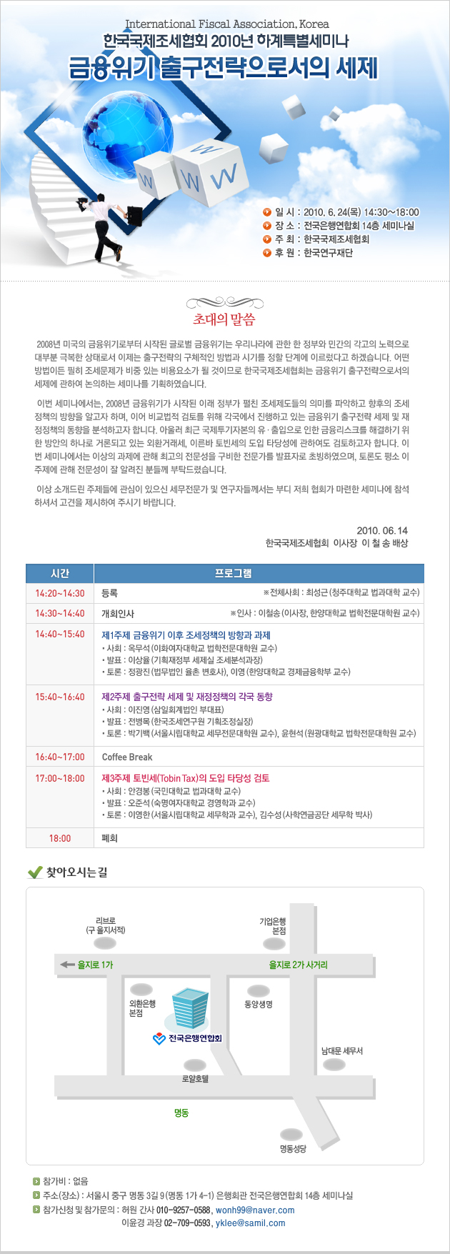 ´ëÁÖÁ¦ : ±ÝÀ¶À§±â ÃⱸÀü·«À¸·Î¼ÀÇ ¼¼Á¦ ÀÏ ½Ã : 2010. 6. 24. (¸ñ) ¿ÀÈÄ 2½Ã 30ºÐ ~ 6½Ã Àå ¼Ò : Àü±¹ÀºÇ࿬ÇÕȸ 14Ãþ ¼¼¹Ì³ª½Ç ÁÖ ÃÖ : Çѱ¹±¹Á¦Á¶¼¼Çùȸ ÈÄ ¿ø : Çѱ¹¿¬±¸Àç´Ü