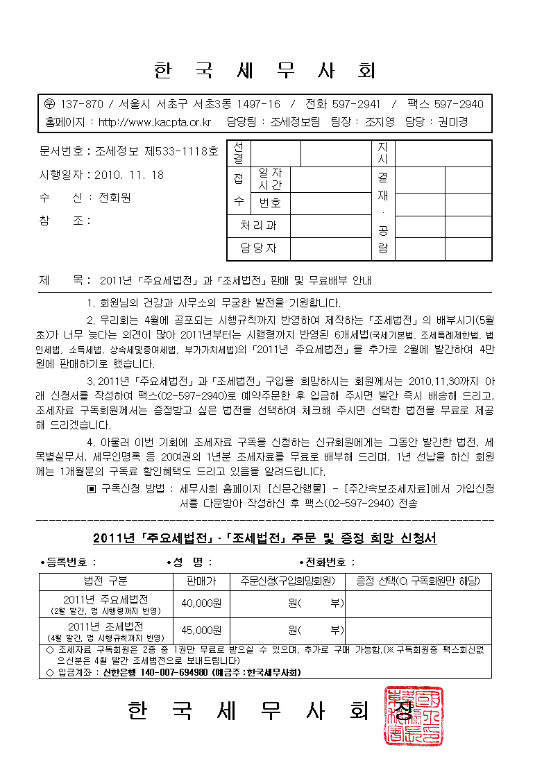 2011³â ÁÖ¿ä¼¼¹ýÀü°ú Á¶¼¼¹ýÀü ÆÇ¸Å ¹× ¹«·á¹èºÎ ¾È³»