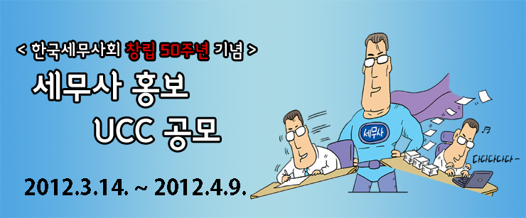 Çѱ¹¼¼¹«»çȸ ⸳ 50Áֳ⠡®¼¼¹«»ç ¿ªÇÒ È«º¸ UCC¡¯ °ø¸ð Á¶¼¼ ¹× ȸ°èºÐ¾ß Àü¹®°¡ ´ÜüÀÎ Çѱ¹¼¼¹«»çȸ°¡ ¿ÃÇØ ⸳ 50ÁÖ³âÀ» ¸Â¾Æ ±¹¹Î°ú ÇÔ²²ÇÏ´Â ¼¼¹«»ç¿¡ ´ëÇÑ ÀÌÇØ¸¦ µ½°í Ä£¹Ð°¨À» ³ôÀÌ´Â ±âȹÀÇ Âü½ÅÇÑ UCC¸¦ °ø¸ðÇÕ´Ï´Ù. Æò¼Ò °ÇÀüÇÑ Á¶¼¼¹®È Á¤Âø°ú ¼¼¹«»ç¿¡ ´ëÇØ °ü½É ÀÖ´Â ±¹¹Î ¿©·¯ºÐÀÇ ¸¹Àº Âü¿© ¹Ù¶ø´Ï´Ù. <°ø¸ð¿ä°> - ºÎ¹® : UCC (User Created Contents) µ¿¿µ»ó - ´ë»ó : ±¹³» °ÅÁÖÇÏ´Â °³ÀÎ ¶Ç´Â ´Üü·Î ÀÚ°ÝÁ¦ÇÑ ¾øÀ½(1ÀÎ/´Üü 1ÀÛǰ¸¸ °¡´É) - ÁÖÁ¦ : ¡°´ëÇѹα¹ ¼¼±Ý¸àÅä ¼¼¹«»ç¡± - ±â°£ : 2012. 3. 14.(¼ö) ¡ 2012. 4. 9.(¿ù) - Á¢¼ö¹æ¹ý : ¿øº»ÆÄÀÏÀ» CD ¶Ç´Â USB¿¡ ³Ö¾î ¿ìÆí Á¦Ãâ(ÀÀ¸ð¸¶°¨ÀÏ ¿ìÆí¼ÒÀαîÁö Á¢¼ö °¡´É) - Ãâǰ±Ô°Ý - ½É»ç±âÁØ : ÁÖÁ¦ ÀûÇÕ¼º(40%), Ç¥Çö ¿ì¼ö¼º(30%), ³»¿ëÀü´Þ ¿ëÀ̼º(30%) ¡Ø ½É»ç¿¡ µû¶ó ¼ö»óÀÛÀÌ ¾øÀ» ¼öµµ ÀÖÀ½ - ½Ã»ó³»¿ª : 24¸í, »ó±ÝÃÑ¾× 900¸¸¿ø ¡Ø Á¦¼¼°ø°ú±Ý º»ÀÎ ºÎ´ã - ´ç¼±ÀÛ ¹ßÇ¥ : ÃßÈÄ È¨ÆäÀÌÁö °øÁö ¿¹Á¤