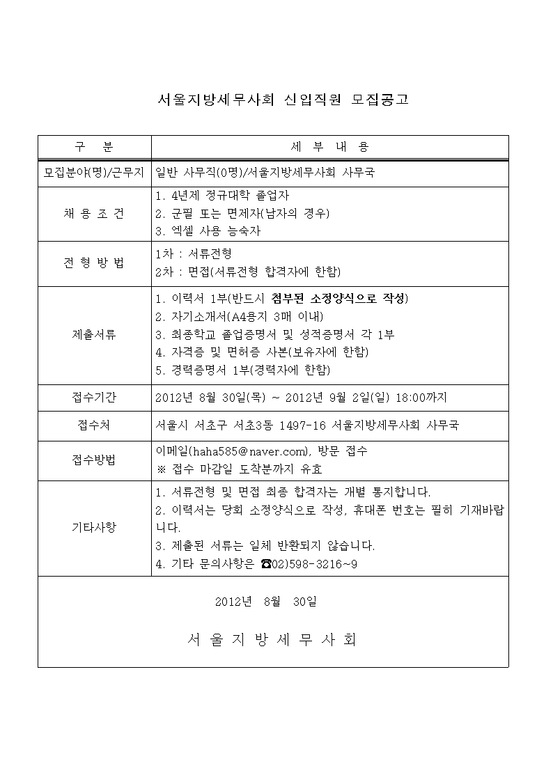 ¼¿ïÁö¹æ¼¼¹«»çȸ »ç¹«±¹ Á÷¿ø¸ðÁý