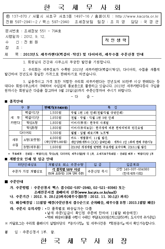 2013³âµµ ¼¼¹«Ä«·»´Ù(º®°ÉÀÌ, Ź»ó) ¹× ´ÙÀ̾, ¼¼¹«¼öø ÁÖ¹®½Åû ¾È³»