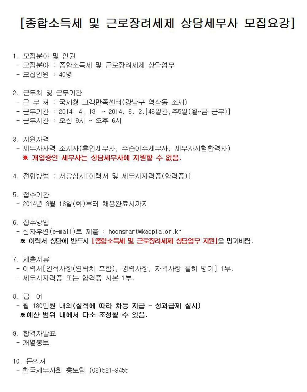 ±¹¼¼Ã» °í°´¸¸Á·¼¾ÅÍ¿¡¼ ÇѽÃÀûÀ¸·Î 'Á¾Çռҵ漼 ¹× ±Ù·ÎÀå·Á¼¼Á¦ »ó´ã¾÷¹«'¸¦ ´ã´çÇÒ ¼¼¹«»çÀÚ°ÝÀÚ(ÈÞ¾÷¼¼¹«»ç, ¼ö½ÀÀ̼ö¼¼¹«»ç, ¼¼¹«»ç½ÃÇèÇÕ°ÝÀÚ)¸¦ ¸ðÁýÇÕ´Ï´Ù.