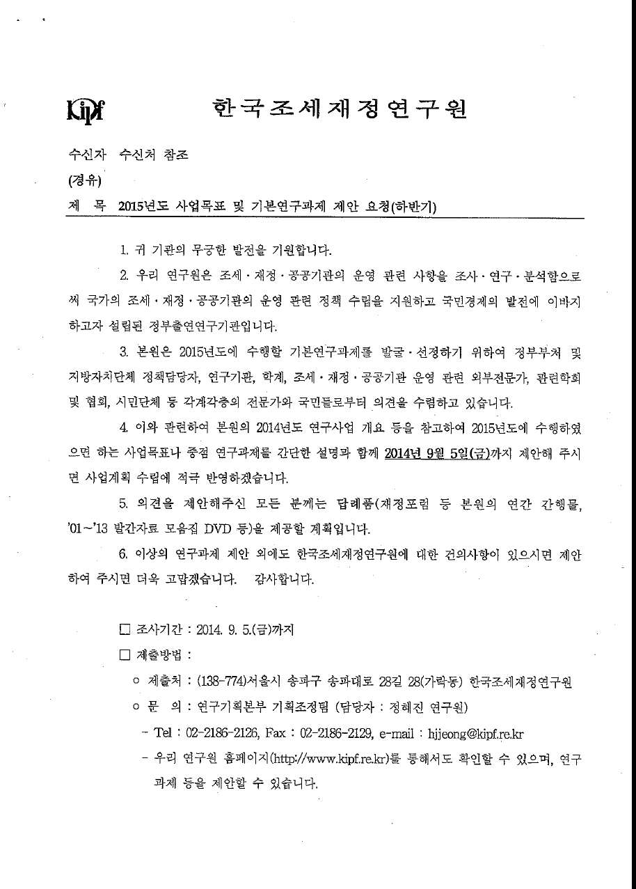 Ç×»ó Çѱ¹Á¶¼¼¿¬±¸¼ÒÀÇ ¹ßÀü°ú Á¶¼¼Á¦µµ ¹× ¼¼¹«»çÁ¦µµÀÇ °³¼±À» À§ÇÏ¿© ¸¹Àº °ü½ÉÀ» º¸¿©Áֽɿ¡ °¨»çµå¸³´Ï´Ù. ºÙÀÓ ÆÄÀϰú °°ÀÌ Çѱ¹Á¶¼¼ÀçÁ¤¿¬±¸¿øÀÇ ¡°2015³âµµ »ç¾÷¸ñÇ¥ ¹× ±âº»¿¬±¸°úÁ¦ Á¦¾È ¿äû(ÇϹݱâ)¡±À¸·Î º» ¿¬±¸¼Ò¿¡ Á¢¼öµÈ ÀǰßÁ¶È¸¿Í °ü·ÃÀÔ´Ï´Ù. µ¿ ³»¿ë¿¡ ´ëÇÏ¿© ÀǰßÀÌ ÀÖÀ¸½Å °æ¿ì Çѱ¹Á¶¼¼¿¬±¸¼Ò(d6021@hanmail.net)·Î 2014³â 9¿ù 1ÀÏ(¿ù¿äÀÏ)±îÁö ȸ½ÅÇÏ¿© Áֽøé ÃëÇÕÇÏ¿© ¿ì¸® ¿¬±¸¼ÒÀÇ ÀǰßÀ¸·Î Çѱ¹Á¶¼¼ÀçÁ¤¿¬±¸¿ø¿¡ Á¦ÃâÅä·Ï ÇϰڽÀ´Ï´Ù. °¨»çÇÕ´Ï´Ù.