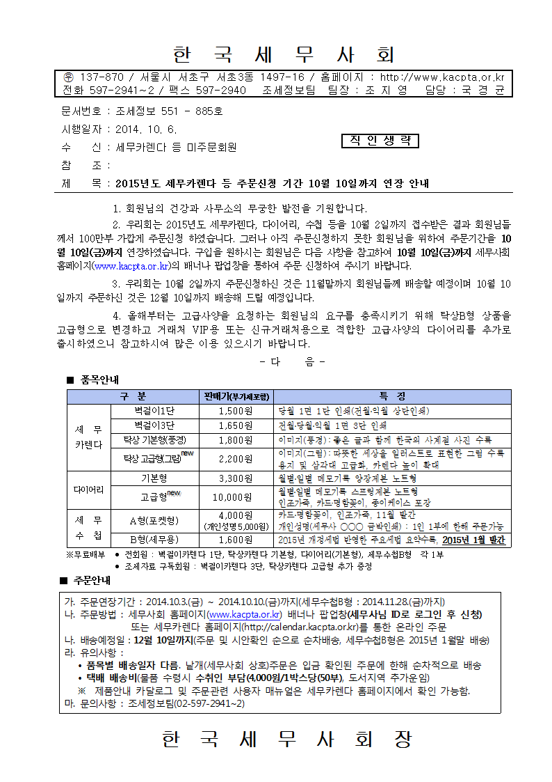2015³âµµ ¼¼¹«Ä«·»´Ù µî ÁÖ¹®½Åû ±â°£ 10¿ù 10ÀϱîÁö ¿¬Àå ¾È³»