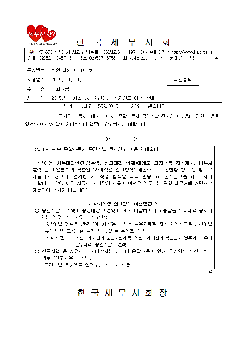 ±¹¼¼Ã» ¼Òµæ¼¼°ú¿¡¼ 2015³â Á¾Çռҵ漼 Áß°£¿¹³³ ÀüÀڽŰí À̿뿡 °üÇÑ ³»¿ëÀ» ¾Ë·Á¿Í ¾È³»ÇÏ¿À´Ï ¾÷¹«¿¡ Âü°íÇϽñ⠹ٶø´Ï´Ù.