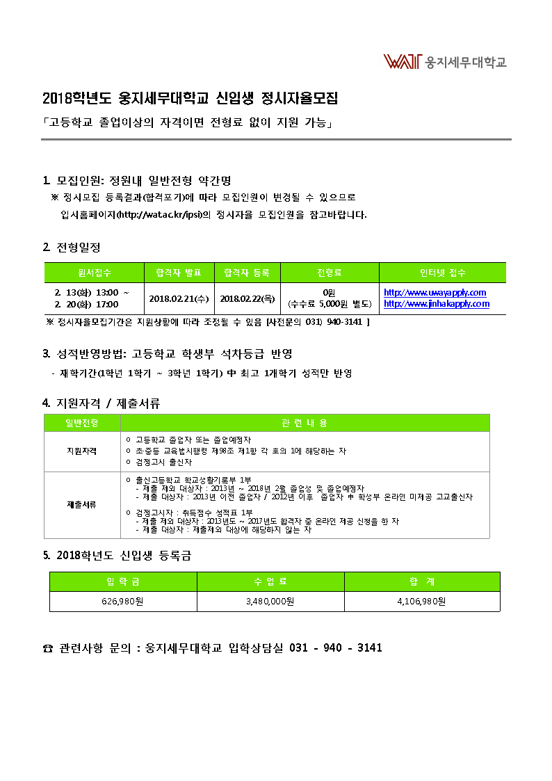 1. ¿õÁö¼¼¹«´ëÇб³ ÀÔÇÐÈ«º¸Ã³-103(2018.2.10)È£ °ü·ÃÀÔ´Ï´Ù. 2. ¿ì¸®È¸¿Í »êÇÐÇù·Â Çù¾àÀ» ü°áÇÑ ¿õÁö¼¼¹«´ëÇб³¿¡¼ 2018Çг⵵ Á¤½ÃÀÚÀ²¸ðÁý ÀüÇü ¾È³» È«º¸ÇùÁ¶ ¿äûÀÌ ÀÖ¾î ´ÙÀ½°ú °°ÀÌ ¾È³»µå¸®¿À´Ï Âü°íÇϽñ⠹ٶø´Ï´Ù.