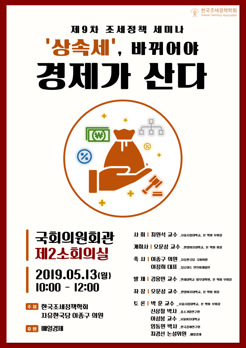1. ÁÖÃÖ : Çѱ¹Á¶¼¼Á¤Ã¥ÇÐȸ, ÀÚÀ¯Çѱ¹´ç ÀÌÁ¾±¸ ÀÇ¿ø 2. ÈÄ¿ø : ¸ÅÀϰæÁ¦ 3. ³¯Â¥ : 2019.5.13.(¿ù) 10:00 - 12:00 4. »çȸ : ÃÖ¿ø¼® ¼¿ï½Ã¸³´ë ±³¼ö, ¹ßÁ¦ : ±è¿ë¹Î ¿¬¼¼´ë ±³¼ö
