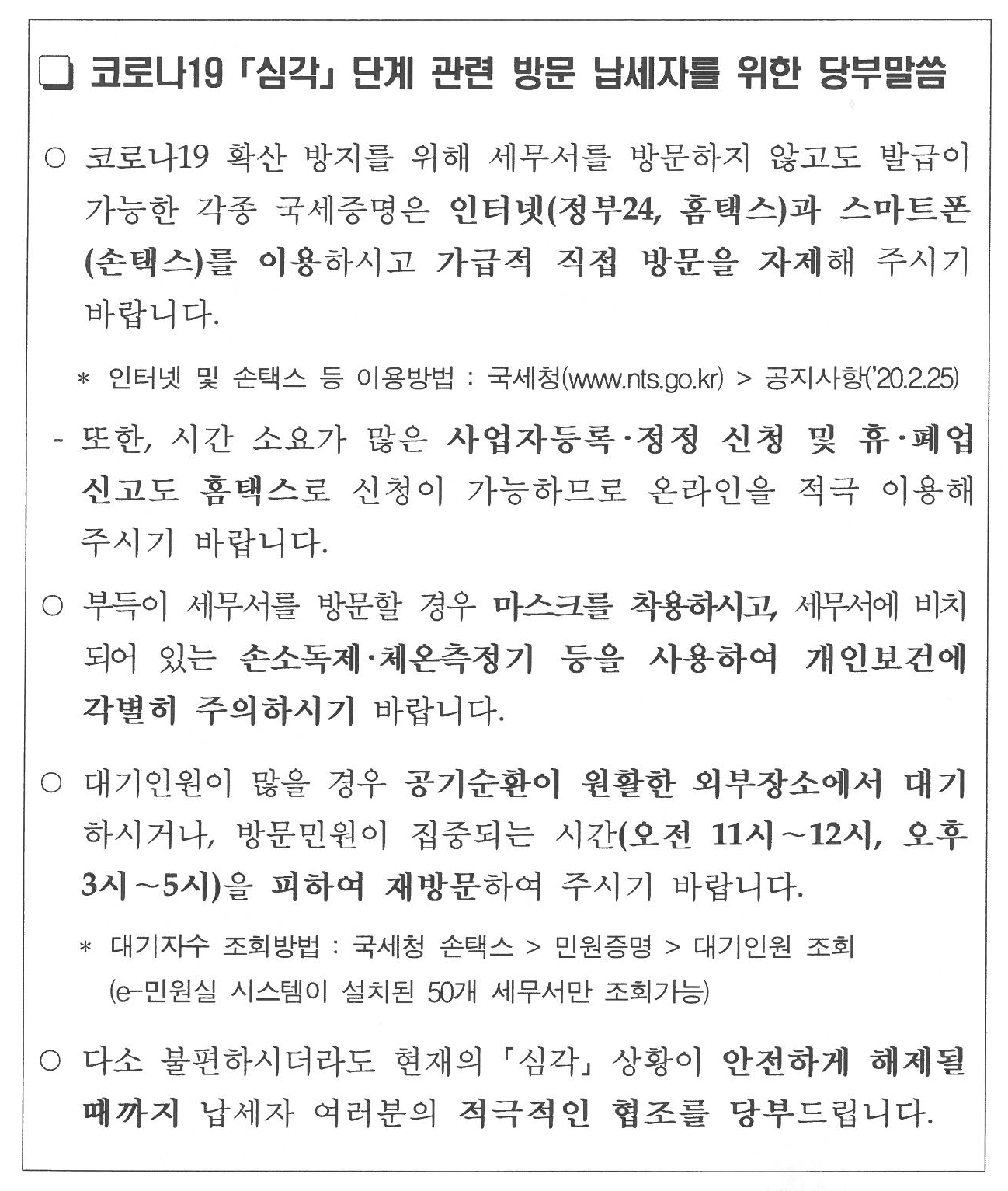 2. ±¹¼¼Ã»¿¡¼´Â 'Äڷγª19'¿¡ ´ëÇÑ Á¤ºÎ À§±â°æº¸ '½É°¢'´Ü°è ¹ß·É¿¡ µû¶ó ¼¼¹«¼¸¦ ¹æ¹®ÇÏ´Â ³³¼¼ÀÚ¸¦ ÅëÇÑ ¹ÙÀÌ·¯½º °¨¿° ¹× È®»ê ¹æÁö¸¦ À§ÇØ ½É°¢´Ü°è°¡ ¾ÈÀüÇÏ°Ô ÇØÁ¦µÉ ¶§ ±îÁö Á÷Á¢ ¹æ¹®À» ÀÚÁ¦Çϵµ·Ï Àû±ØÀûÀ¸·Î È«º¸Çϰí ÀÖ½À´Ï´Ù.