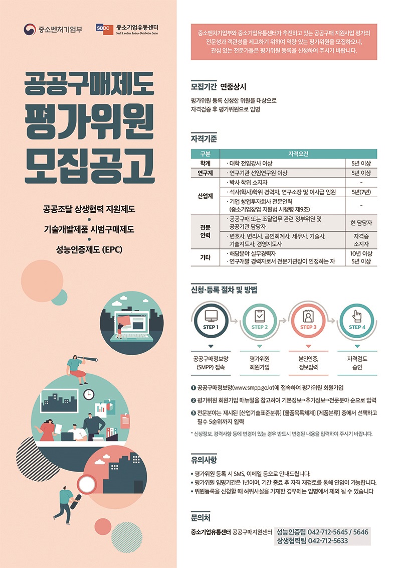 1) ¸ðÁý¸í : °ø°ø±¸¸ÅÁ¦µµ Æò°¡(½É»ç)À§¿ø ¸ðÁý 2) ¸ðÁý±â°£ : »ó½Ã¸ðÁý 3) ½Åû¹æ¹ý : °ø°ø±¸¸ÅÁ¾ÇÕÁ¤º¸¸Á(SMPP) ȨÆäÀÌÁö¸¦ ÅëÇÑ ¿Â¶óÀÎ ½Åû 4) ÀڰݱâÁØ : ¼¼¹«»ç ÀÚ°ÝÁõ ¼ÒÁöÀÚ 5) ÀÓ±â : 1³â (°¢Á¾ Æò°¡ ½É»ç¿¡ Àü¹®°¡·Î À§ÃË ¿¹Á¤) 6) ±× ¿Ü ±âŸ»çÇ× : ¼¼ºÎ³»¿ë °ø°í¹® ¹× ºÙÀÓÆÄÀÏ Âü°í 7) ¸ðÁý°ø°í ȨÆäÀÌÁö : Áß¼Ò±â¾÷À¯Åë¼¾ÅÍ °øÁö»çÇ× ( ¹Ù·Î°¡±â Ŭ¸¯ )