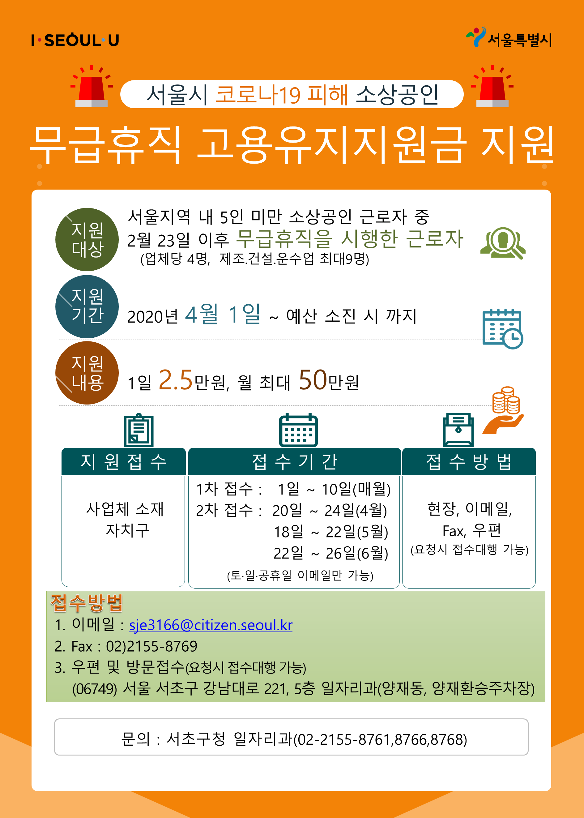 °¡. Áö¿ø´ë»ó : ¼¿ï½Ã³» 5Àι̸¸ ¼Ò»ó°øÀÎ ±Ù·ÎÀÚ Áß 2¿ù 23ÀÏ ÀÌÈÄ ¹«±ÞÈÞÁ÷À» ½ÃÇàÇÑ ±Ù·ÎÀÚ(¾÷ü´ç 1¸í, °ü±¤»ç¾÷Àº 2¸í) ³ª. Áö¿ø±â°£ : 2020³â 4¿ù 1ÀÏ ~ ¿¹»ê ¼ÒÁø½Ã±îÁö ´Ù. Áö¿ø³»¿ë : 1ÀÏ 2.5¸¸¿ø, ¿ù ÃÖ´ë 50¸¸¿ø ¶ó. Áö¿øÁ¢¼ö : »ç¾÷ü ¼ÒÀç ÀÚÄ¡±¸(¼Ãʱ¸ ¼ÒÀç »ç¾÷ü´Â ¼Ãʱ¸Ã» ÀÏÀÚ¸®°ú) ¸¶. Á¢¼ö±â°£ : ¸Å¿ù1ÀÏ ~ 10ÀÏ(Åä,ÀÏ,°øÈÞÀÏÀº À̸ÞÀϸ¸ °¡´É) ¹Ù. Á¢¼ö¹æ¹ý : ÇöÀå, À̸ÞÀÏ, fax, ¿ìÆí