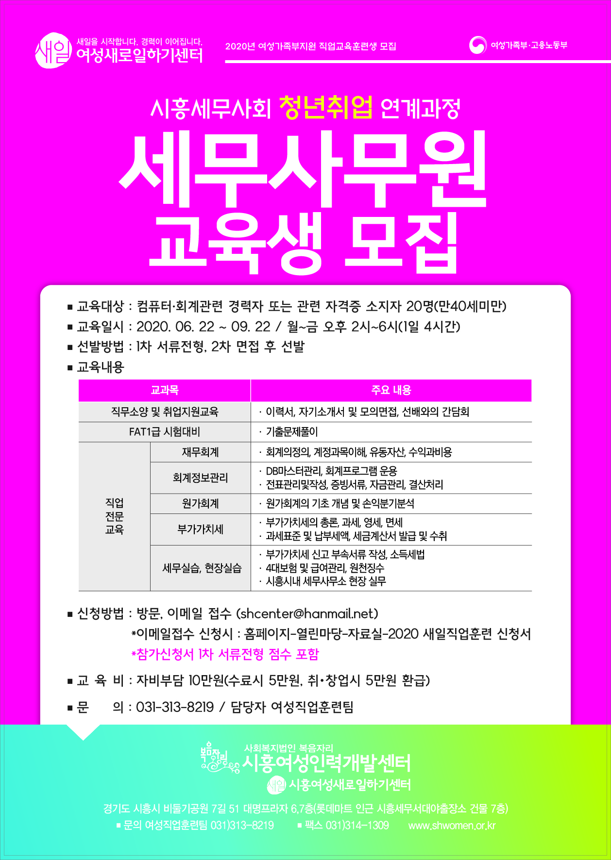 2. ¿ì¸®È¸¿Í ¾÷¹«Çù¾àÀ» ü°áÇÑ ½ÃÈï¿©¼ºÀη°³¹ß¼¾ÅÍ¿¡¼ ¿©¼º°¡Á·ºÎ Áö¿ø Á÷¾÷±³À°ÈÆ·Ã '¼¼¹«»ç¹«¿ø¾ç¼º°úÁ¤' ÈÆ·Ã»ý ¸ðÁý È«º¸ ¿äûÀÌ ÀÖ¾î ´ÙÀ½°ú °°ÀÌ ¾È³»ÇÏ¿À´Ï Âü°íÇϽñ⠹ٶø´Ï´Ù.