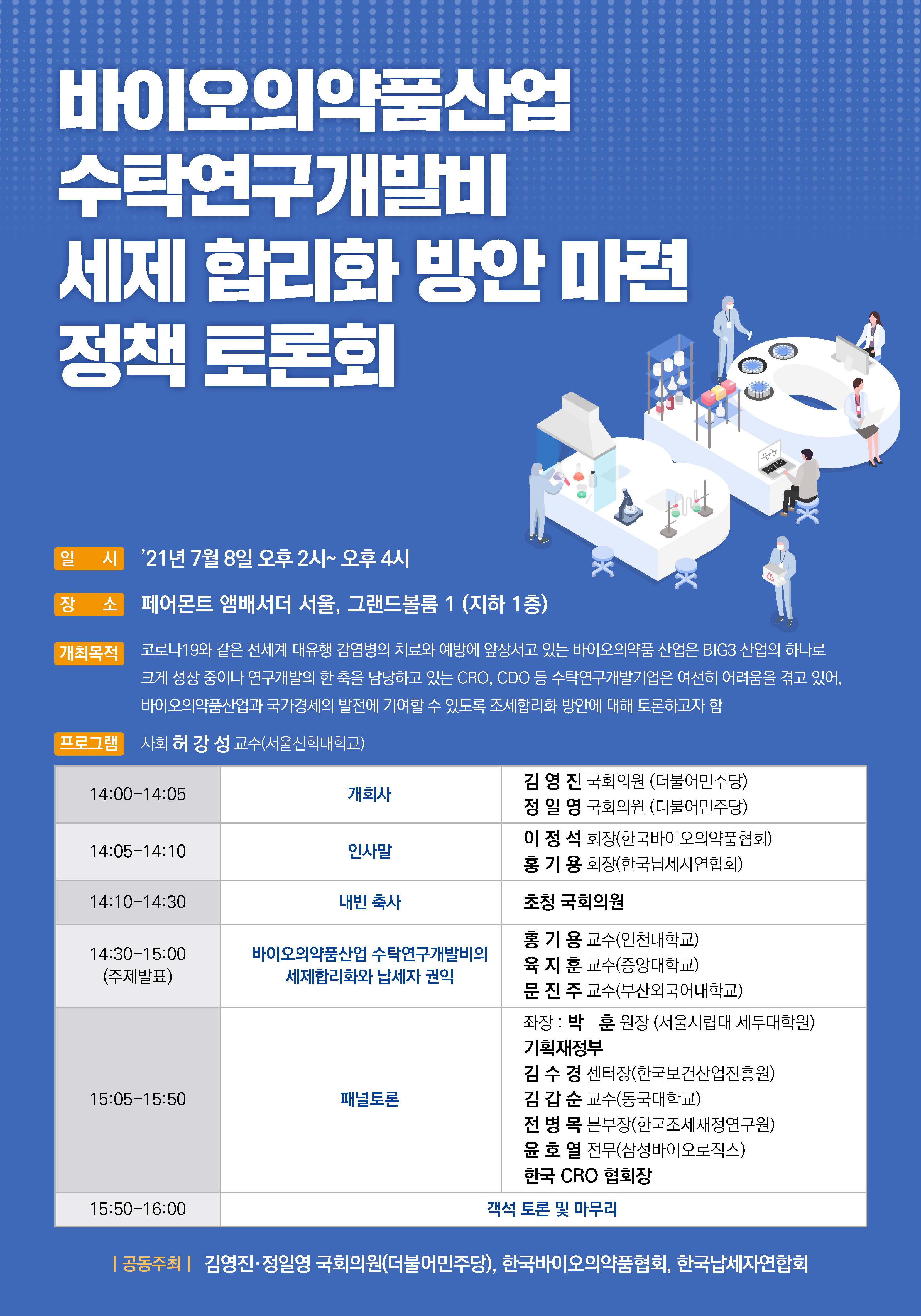 1. ÁÖÁ¦ : ¹ÙÀÌ¿ÀÀǾàǰ»ê¾÷ ¼öŹ¿¬±¸°³¹ßºñ ¼¼Á¦ÇÕ¸®È ¹æ¾È ¸¶·Ã Á¤Ã¥Åä·Ðȸ 2. ÀϽà : 2021³â 7¿ù 8ÀÏ ¿ÀÈÄ 2½Ã - ¿ÀÈÄ 4½Ã 3. Àå¼Ò : Æä¾î¸óÆ® ¾Ú¹è¼´õ ¼¿ï, ±×·£µåº¼·ë 1 (ÁöÇÏ 1Ãþ) 4. ¹®ÀÇó : Çѱ¹³³¼¼ÀÚ¿¬ÇÕȸ(02-3452-8372) |