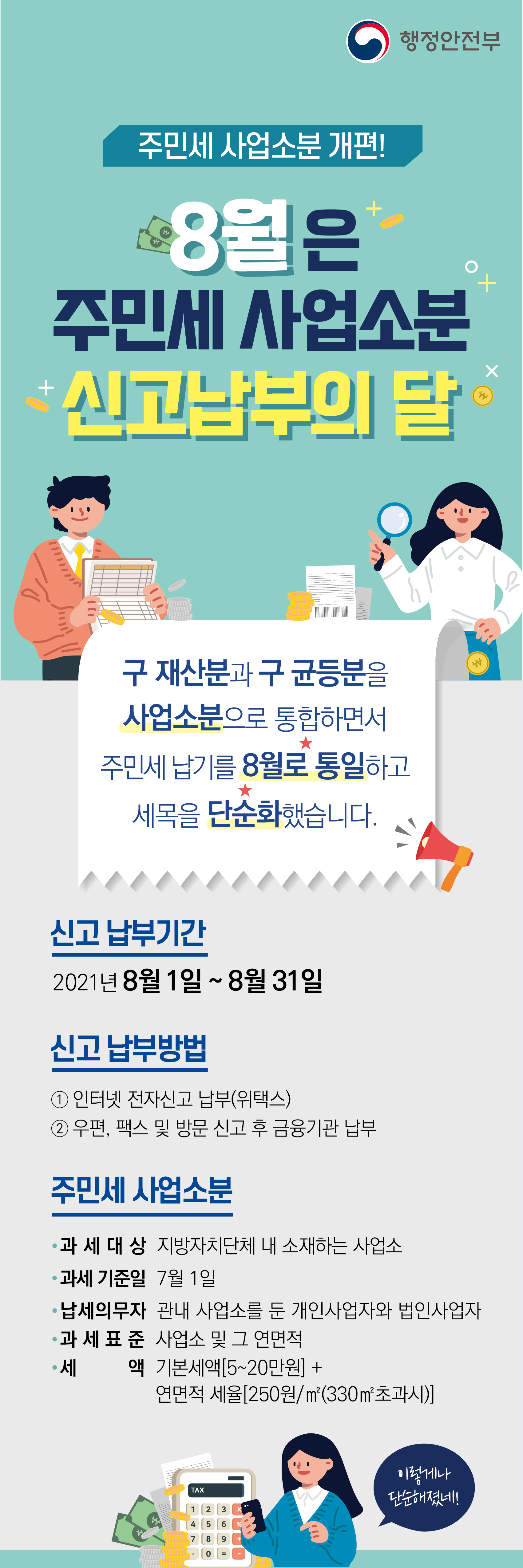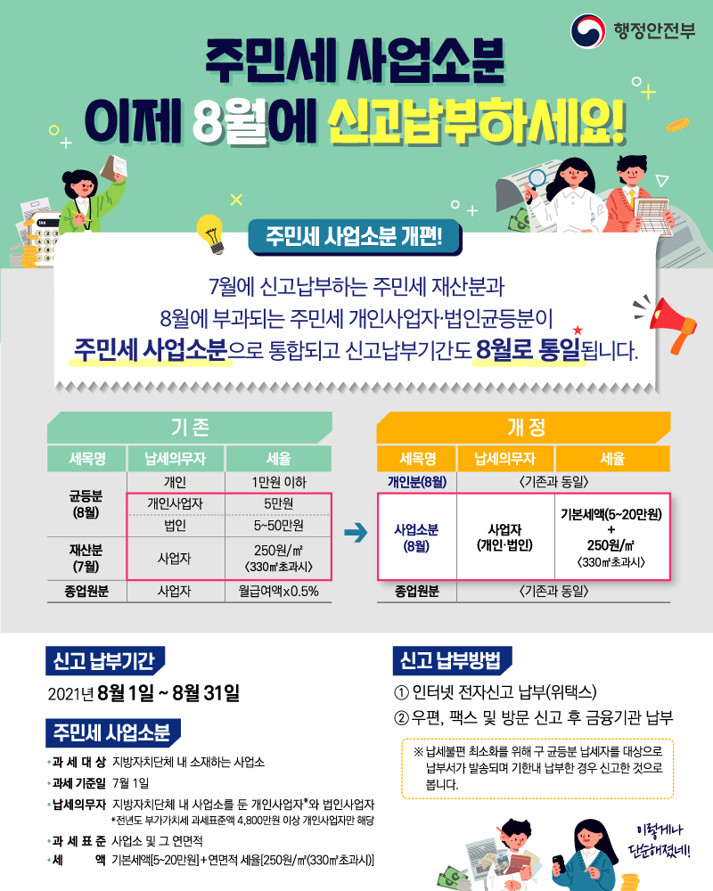 1. 2021³âºÎÅÍ Áֹμ¼ °ú¼¼Ã¼°è°¡ °³ÆíµÊ¿¡ µû¶ó ±âÁ¸¿¡ 7¿ù¿¡ ½Å°í³³ºÎÇÏ´Â Áֹμ¼ ÏÁÀç»êºÐ°ú 8¿ù¿¡ ºÎ°úµÇ´Â Áֹμ¼ ÏÁ±ÕµîºÐ(°³Àλç¾÷ÀÚ,¹ýÀκÐ)À» Áֹμ¼ »ç¾÷¼ÒºÐÀ¸·Î ÅëÇÕÇÏ°í ½Å°í³³ºÎ±â°£µµ 8¿ù·Î ÅëÀÏÇÏ¿´½À´Ï´Ù.