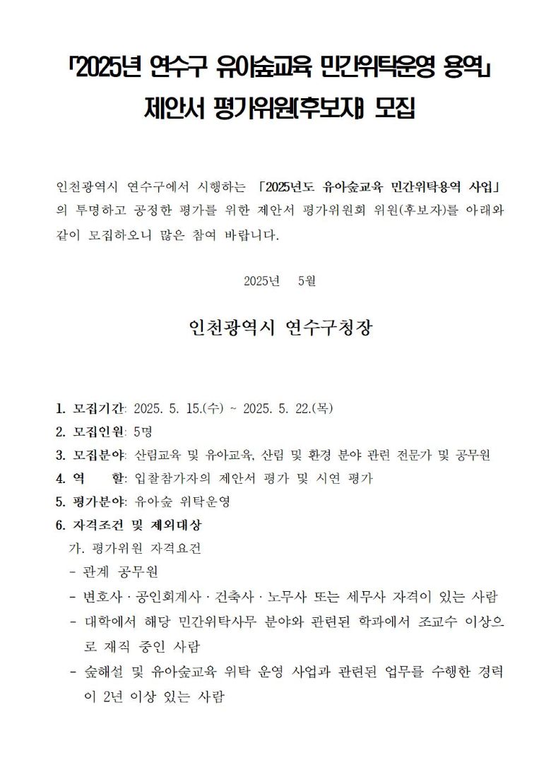 [¿¬¼ö±¸Ã»]¡¸2025³â ¿¬¼ö±¸ À¯¾Æ½£±³À° ¹Î°£À§Å¹¿î¿µ ¿ë¿ª¡¹Á¦¾È¼ Æò°¡À§¿ø(Èĺ¸ÀÚ) ¸ðÁý ¾È³»