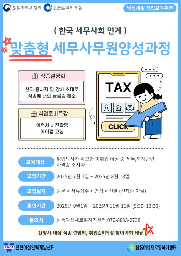 3. ÀÎõ¿©¼ºÀη°³¹ß¼¾ÅÍ¿¡¼ ÁøÇàÇÏ´Â ¡®(Çѱ¹¼¼¹«»çȸ¿¬°è)¸ÂÃãÇü ¼¼¹«»ç¹«¿ø ¾ç¼º°úÁ¤¡¯ ¿¡ ´ëÇÑ ¸ðÁý ³»¿ëÀ» ¾È³»µå¸®¿À´Ï ¼¼¹«»ç»ç¹«¼Ò¿¡¼ ½Ç¹« ¿ª·®À» °®Ãá Àü¹® ÀÎÀç·Î ¼ºÀåÇÏ¿© ¾ÈÁ¤ÀûÀ̰í Áö¼Ó °¡´ÉÇÑ Ä¿¸®¾î¸¦ ²Þ²Ù´Â ºÐµéÀÇ ¸¹Àº °ü½É°ú Âü¿© ¹Ù¶ø´Ï´Ù. ¡¤ ¸ðÁý±â°£ : ~ 8.18(¿ù) 17:00±îÁö ¡¤ ÈÆ·Ã±â°£ : 2025.9.1.(¿ù) ~ 11.11.(È) ¿ÀÀü 09:30~13:30 ¡¤ ÁÖ¿ä ³»¿ë : ¼¼¹«»ç¹«¿ø ±âÃʾ÷¹« ¹× À繫ȸ°è ±âÃÊÀÌ·Ð µî ¡¤ ´ë»ó : Àü»êȸ°è ÀÚ°ÝÁõ ¼ÒÁöÀÚ Áß Ãë¾÷À» Èñ¸ÁÇÏ´Â ¿©¼º Áß ¸éÁ¢¼±¹ßÀ» ÅëÇØ ÇÕ°ÝÇÑ ÀÚ ¡¤ ÈÆ·ÃÇýÅà : ÈÆ·Ã Âü¿©ÀÚ ±³Åëºñ, Âü¿©ÃËÁø¼ö´ç Áö¿ø(´ÜÀ§±â°£ Ãâ¼®·ü 80%ÀÌ»óÀÚ) ¡¤ ¹®ÀÇ : ³²µ¿¿©¼º»õ·ÎÀÏÇϱ⼾ÅÍ (T.032-469-1251)