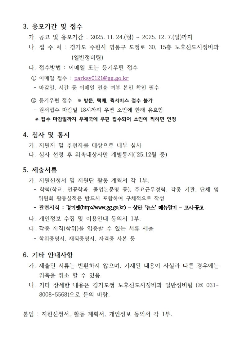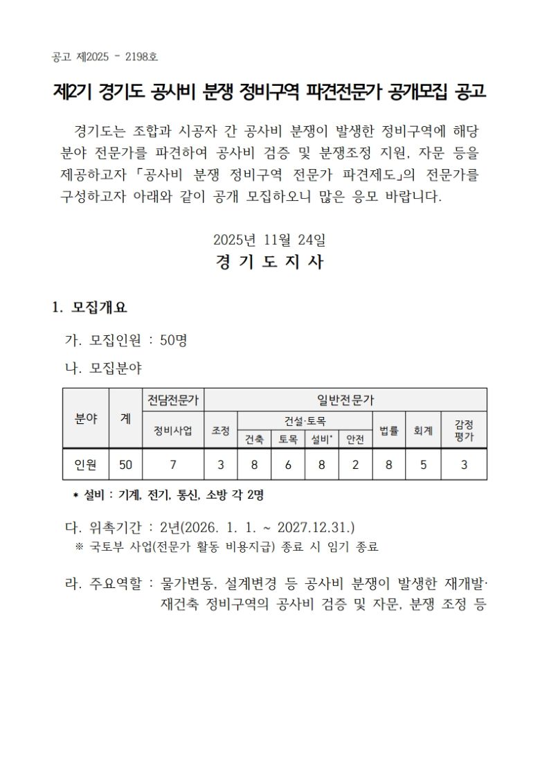 °æ±âµµÃ»¿¡¼ ¡®Á¦2±â ¡¸°æ±âµµ °ø»çºñ ºÐÀï Á¤ºñ±¸¿ª Àü¹®°¡ ÆÄ°ßÁ¦µµ¡¹Àü¹®°¡ °ø°³¸ðÁý¡¯°ú °ü·ÃÇÏ¿© ¿ì¸® ȸ¿¡ È«º¸ ¿äûÇÏ¿´±â¿¡ ¾Æ·¡¿Í °°ÀÌ ¾È³»ÇÕ´Ï´Ù. 1. ¸ðÁýÀοø: ÃÑ 50¸í 2. ¸ðÁý±â°£: 2025.11.24.~2025.12.7. 3. Á¢¼ö¹æ¹ý: À̸ÞÀÏ ¶Ç´Â µî±â¿ìÆí Á¢¼ö(¡Ø[ºÙÀÓ1]¸ðÁý°ø°í ÂüÁ¶) 4. Á¦Ãâ¼·ù: ¨ç½Åû¼. ¨è°³ÀÎÁ¤º¸µ¿ÀǼ, ¨é½Åû ¿ä¾à¼, ¨êÁõºù¼·ù(ÀçÁ÷¡¤ÇÐÀ§¡¤ÀÚ°ÝÁõ, À§ÃËÀå µî)