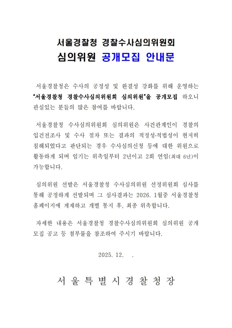 ¼¿ï°æÂûû¿¡¼ ¡®¼¿ï°æÂûû °æÂû¼ö»ç½ÉÀÇÀ§¿øÈ¸ °ø°³¸ðÁý¡¯°ú °ü·ÃÇÏ¿© ¿ì¸® ȸ¿¡ È«º¸ ¿äûÇÏ¿´±â¿¡ ¾Æ·¡¿Í °°ÀÌ ¾È³»ÇÕ´Ï´Ù. 1. ¸ðÁý±â°£: 2025. 12. 11.(¸ñ) 09:00 ~ 2025. 12. 24.(¼ö) 18:00 [14Àϰ£] 2. ¸ðÁýÀοø: 00¸í À̳» 3. ÀÓ ±â: À§ÃËÀϷκÎÅÍ 2³â(2³â ¿¬ÀÓ °¡´É) 4. Á¢¼ö¹æ¹ý : ÀüÀÚ¿ìÆí(eunhyun0706@police.go.kr) Á¦Ãâ ¡Ø Á¢¼ö´Â ¸¶°¨ÀÏ 18:00 ¼ö½ÅºÐ±îÁö À¯È¿ ¡Ø ÀüÀÚ¿ìÆí ½ÅûÀÌ Á¤»ó Á¢¼öµÇ¸é È®ÀÎ ¸ÞÀÏÀ» ȸ½ÅÇØ µå¸± ¿¹Á¤ÇÕ´Ï´Ù. ½ÅûÁ¢¼ö ÈÄ, ±Ù¹«ÀÏ ±âÁØ 3ÀÏ À̳» ȸ½Å ¸ÞÀÏÀ» ¹ÞÁö ¸øÇÑ °æ¿ì, ¾Æ·¡ Á¢¼öó·Î À¯¼±ÀüÈ ¹®ÀÇ ¹Ù¶ø´Ï´Ù. 5. ¹®ÀÇ»çÇ× : ¼¿ï°æÂûû ¼ö»ç°ú ¼ö»ç½ÉÀǰè(¢Ï02-700-3716)