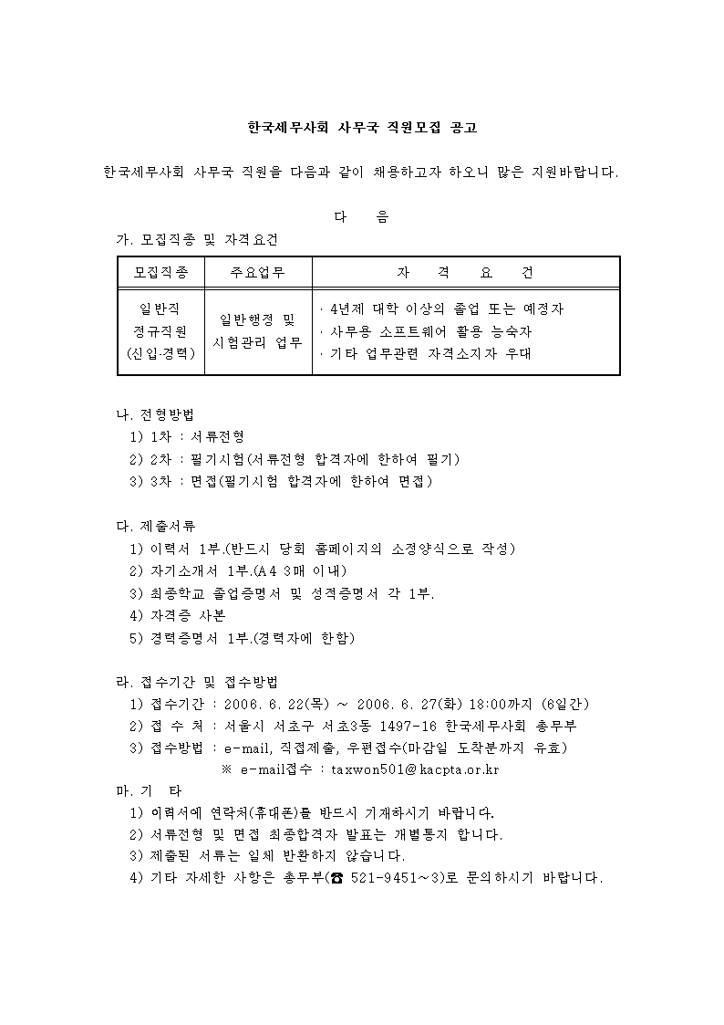 Çѱ¹¼¼¹«»çȸ »ç¹«±¹ Á÷¿ø¸ðÁý °ø°í