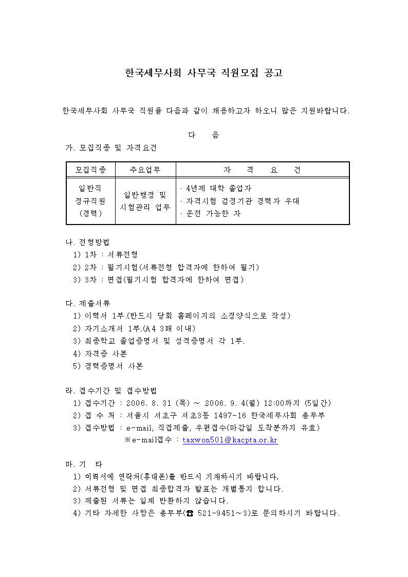Çѱ¹¼¼¹«»çȸ »ç¹«±¹ Á÷¿ø¸ðÁý °ø°í