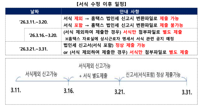 1. ȸ¿ø´ÔÀÇ °Ç°°ú »ç¾÷ÀÇ ¹øÃ¢À» ±â¿øµå¸³´Ï´Ù. 2. 2025³â 12¿ù¸» °á»ê¹ýÀÎÀÇ ¹ýÀμ¼ ½Å°í°ü·Ã ÁÖ¿ä º¯°æ»çÇ×À» ºÙÀÓ°ú °°ÀÌ ¾Ë·Áµå¸®¿À´Ï ¾÷¹«¿¡ Âü°íÇϽñ⠹ٶø´Ï´Ù. <ÁÖ¿ä ³»¿ë> ¡Û Á¶¼¼Æ¯·ÊÁ¦Çѹý½ÃÇà·É Á¦26Á¶ÀÇ8 °³Á¤(¡¯26.2.27. ½ÃÇà)À¸·Î ÅëÇÕ°í¿ë¼¼¾×°øÁ¦ »ó½Ã±Ù·ÎÀÚ ¼ö °è»ê ¹æ½ÄÀÌ º¯°æµÇ¾úÀ½ ¡Û ÅëÇÕ°í¿ë¼¼¾×°øÁ¦ »ó½Ã±Ù·ÎÀÚ ¸í¼¼¼ ¼½Äµµ ÀÔ¹ý¿¹°í ÁßÀ̳ª(26.3.3~16.) ÀÔ¹ý¿¹°í¾È ¼½Ä¿¡ ¼öÁ¤»çÇ×ÀÌ »ý°Ü Àü»ê¹Ý¿µ ÁßÀÓ ¡Û ¼½Ä ¼öÁ¤ ÀÌÈÄ ÀÏÁ¤Àº ¾Æ·¡¿Í °°À½ ¡Û 3.16ÀÏ ÀÌÈÄ ÇØ´ç ¼½Ä¸¸À» ÷ºÎÆÄÀÏ·Î º°µµ Á¦Ãâ °¡´ÉÇÔ(ÇØ´ç¼½ÄÀº ¡°È¨Åýº¡æÀÚ·á½Ç¡± °øÁö ¿¹Á¤ÀÓ)