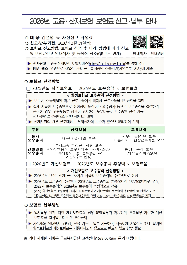 1. ȸ¿ø´ÔÀÇ °Ç°°ú »ç¾÷ÀÇ ¹øÃ¢À» ±â¿øµå¸³´Ï´Ù. 2. ¡¸°í¿ëº¸Çè ¹× »ê¾÷ÀçÇØº¸»óº¸ÇèÀÇ º¸Çè·á¡¼ö µî¿¡ °üÇÑ ¹ý·ü¡¹Á¦17Á¶ ¹× Á¦19Á¶¿¡ ÀǰŠ°Ç¼³¾÷ µî ÀÚÁø½Å°í »ç¾÷ÀåÀº º¸Ç迬µµ¸¶´Ù 1³â µ¿¾È¿¡ »ç¿ëÇÒ ±Ù·ÎÀÚ¿¡°Ô Áö±ÞÇÒ º¸¼öÃѾ×ÀÇ ÃßÁ¤¾×¿¡ µû¸¥ º¸Çè·á(°³»êº¸Çè·á)¿Í ¸Å º¸Ç迬µµÀÇ ¸»ÀϱîÁö »ç¿ëÇÑ ±Ù·ÎÀÚ¿¡°Ô Áö±ÞÇÑ º¸¼öÃѾ׿¡ µû¸¥ º¸Çè·á(È®Á¤º¸Çè·á)¸¦ 3¿ù 31ÀϱîÁö ½Å°íÇÏ¿©¾ß ÇÕ´Ï´Ù. 3. ±Ù·Îº¹Áö°ø´ÜÀÇ ¡®2026³â °Ç¼³¾÷ °í¿ë․»êÀç º¸Çè·á ½Å°í¡® °ü·Ã ÇùÁ¶ ¿äû¿¡ ´ëÇØ ¾Æ·¡¿Í °°ÀÌ ¾È³» µå¸®¿À´Ï ¾÷¹«¿¡ Âü°íÇϽñ⠹ٶø´Ï´Ù.