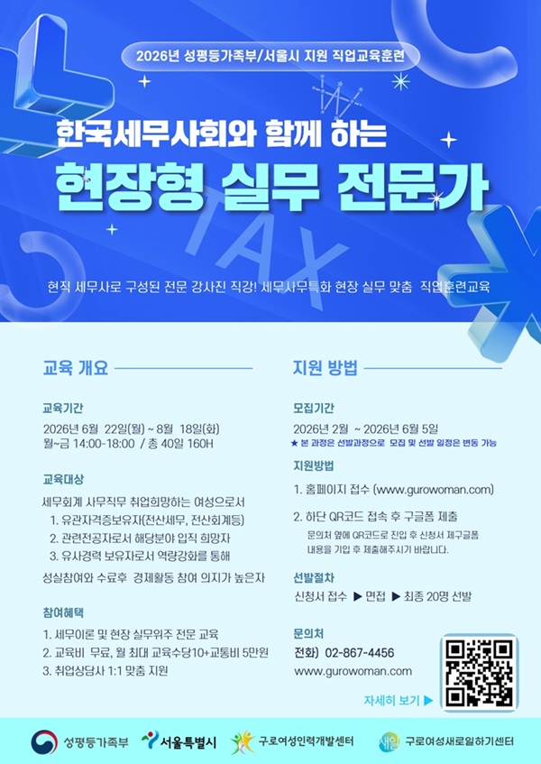 1. Çѱ¹¼¼¹«»çȸ´Â Àϰú °¡Á¤ÀÇ ¾ç¸³ÀÌ °¡´ÉÇÑ ¾çÁúÀÇ ÀÏÀÚ¸®ÀÎ ¼¼¹«»ç¹«¿ø ¾ç¼º°ú Àü»ê¼¼¹«È¸°è°ü·Ã ÀÚ°ÝÁõÀ» ÃëµæÇÑ °æ·Â´ÜÀý¿©¼º ¹× ¿©¼º Ãë¾÷Áغñ»ý ºÐµéÀÇ Ãë¾÷ Áö¿øÀ» À§ÇØ ±¸·Î¿©¼ºÀη°³¹ß¼¾ÅÍ¿Í ÇÔ²² ¡®¼¼¹«½Ç¹«Àü¹®°¡ ¾ç¼º°úÁ¤¡¯ Á÷¾÷ÈÆ·Ã ±³À°°úÁ¤À» °³¼³ÇÏ¿´½À´Ï´Ù.